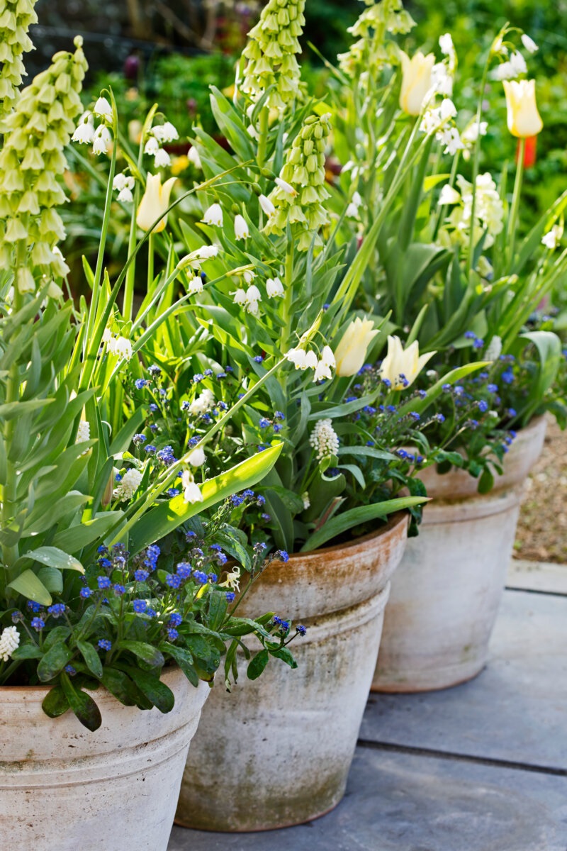 Denk vooruit en vul nu een paar potten met een bloembollenmengsel. Voor deze potten met lentebollen is als topping een wintergroene beplanting gekozen. Zo zijn de potten al meteen mooi na het vullen. En in april geniet je van de bijzondere voorjaarsbollen in wit, zachtgroen en lichtgeel, aangevuld met hemelsblauwe vergeet-me-nietjes.