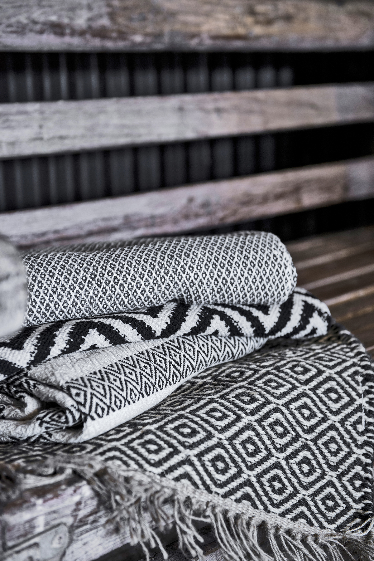Hij trekt direct de aandacht, zo’n royale plaid met opvallend zwart-wit motief. Mooi op een eenvoudige zitbank of in een strakke stoel en verkrijgbaar in diverse motieven. Kijk voor alle motieven in de webshop. Materiaal: katoen | Afmetingen: 160 x 130 cm | Prijs: €19,95