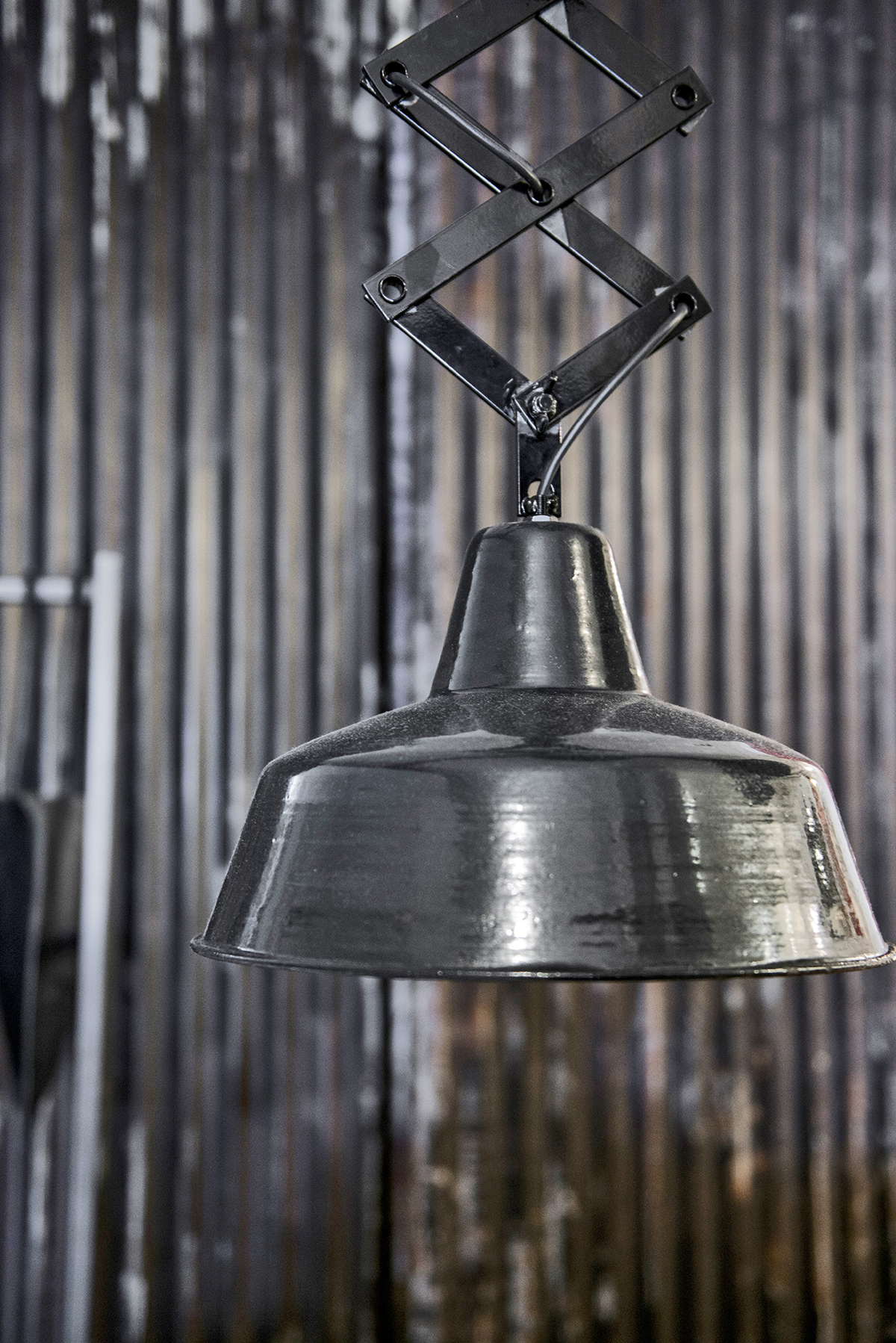 Deze authentieke, vintage industriële hanglamp met zigzagarm en glanzende kap zorgt voor contrast in zowel een klassiek als eigentijds interieur. De lampen zijn alle unieke stuks en mogelijk hier en daar door de tijd wat gebutst. Bekijk in de webshop. Materiaal: metaal | Afmetingen: Ø 35-45 cm | Prijs: €275