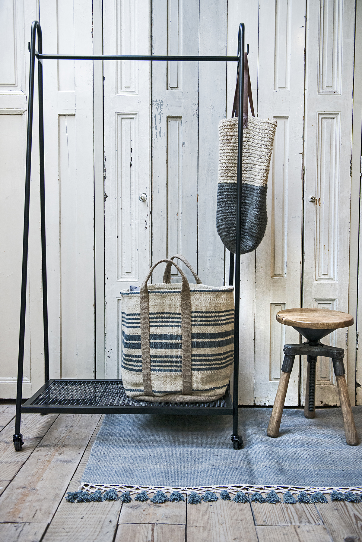 Helemaal van nu is een plant in een grote mand. Zowel de mand als de (boodschappen)tas zijn handgemaakt van zachte, stonewashed jute, de tas is gevoerd met katoen. Juist bij uitgesproken contrasten tussen wit en zwart, of wit en blauw, geven natuurlijke materialen een warm accent. Bekijk in de webshop. Materiaal: stonewashed jute, katoen (tas) | Afmetingen: Ø 60 x hoogte 44 cm (mand) en 44 x 54 cm (tas) | Prijs: €69 (mand) en €69 (tas)