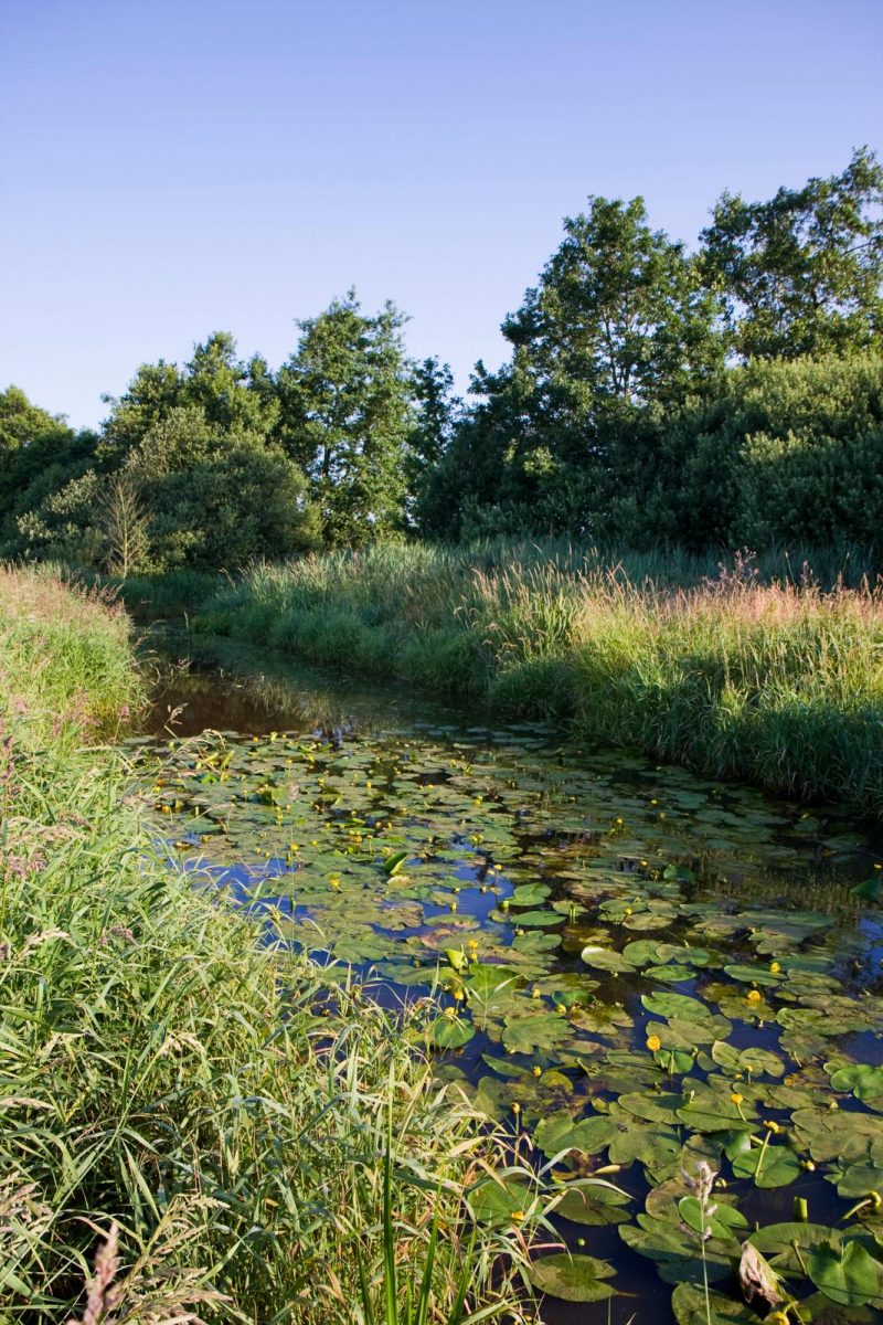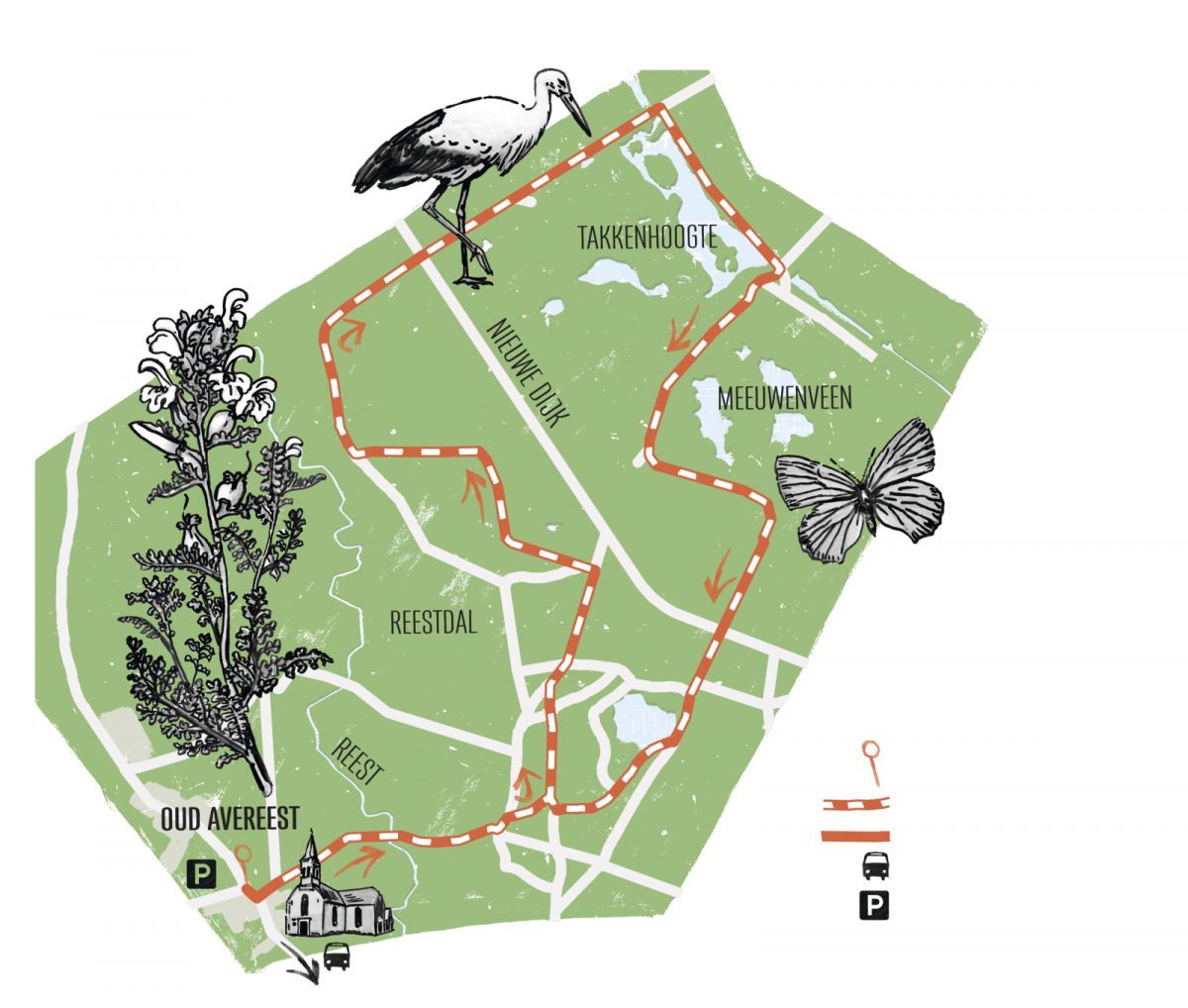 Door het opkopen van grond langs de Reest probeert Landschap Overijssel meer grip te krijgen op de grondwaterstand in het Reestdal, want het gebied kampt met verdroging. Een hogere grondwaterstand is de wens, want dat levert dotterbloemhooilanden op, een landschapstype dat de afgelopen decennia langs de Reest is geslonken. Dotterbloemhooilanden gedijen bij natte omstandigheden: kwelwater uit de grond en af en toe onder water staan zodat mineralenrijk Reestwater de bodem voedt. Zijn die omstandigheden goed dan levert dat in het voorjaar velden vol dotterbloemen op, maar ook moerasviooltje en moeraskartelblad (D), dat wordt gezien als de orchidee van het Reestdal. Bos wijkt voor heide. Het is even wennen, al die ruimte om je heen. Een asfaltweggetje vormt een harde grens tussen Wildenberg en Takkenhoogte/Meeuwenveen, het volgende natuurterrein. Niet alleen het landschap verandert. In de lucht verdringen opgezwollen wolken het hemelblauw en de wind begint zich te roeren. Een felle regenbui trekt over en vanaf de uitzichtheuvel (E) in Takkenhoogte komt een sluimerend landschap ineens in beweging. Berken buigen, het wateroppervlak van rimpelloze vennen raakt ineens verfrommeld met golfjes. Vanaf de heuvel is ook goed te zien hoe boerenland en natuur scherp aan elkaar grenzen. Niet dat een ooievaar (F) zich ook maar iets aantrekt van die grens, want die stapt loom door het frisgroene land, speurend naar voedsel.
