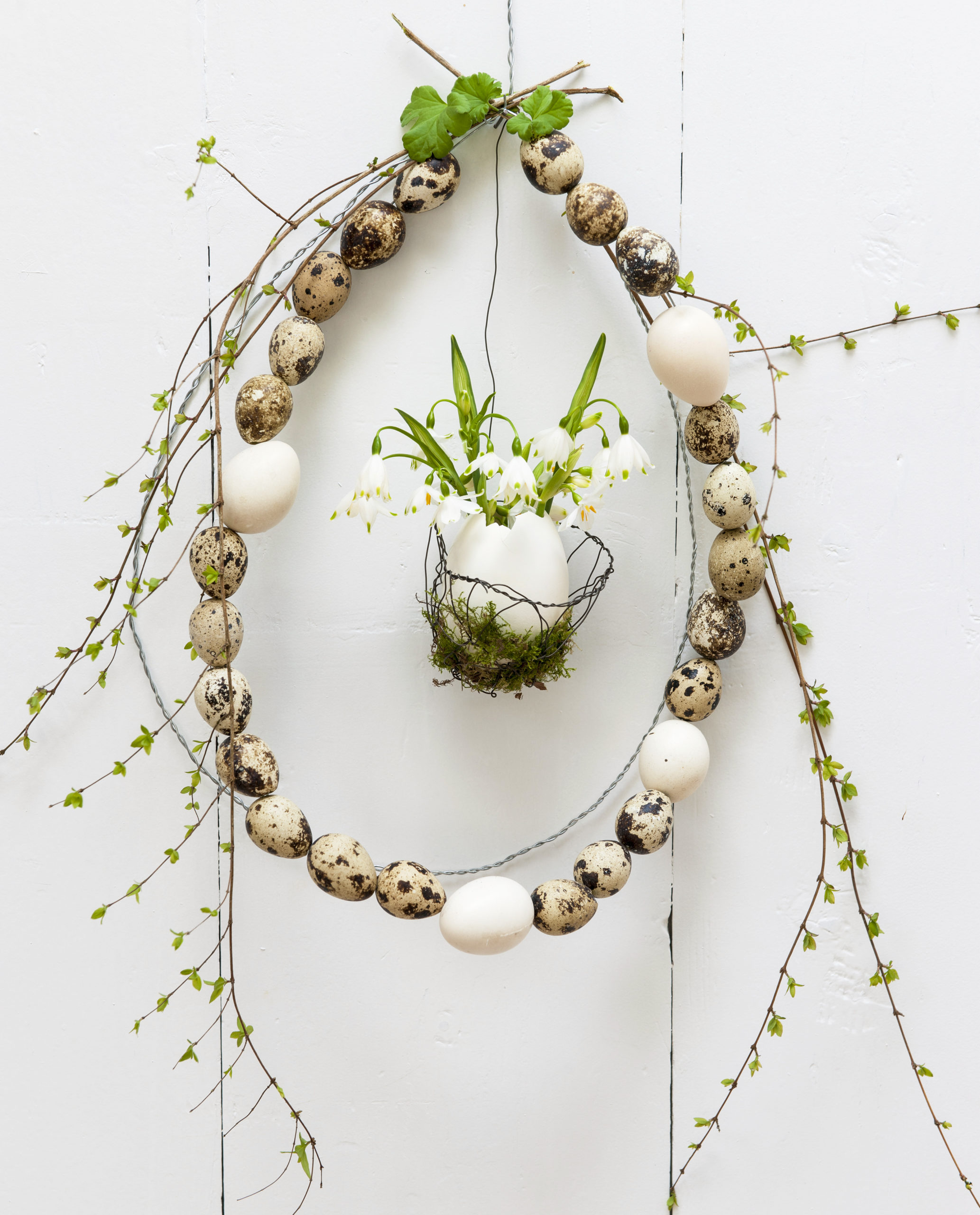 Als kralen zijn de uitgeblazen krielkip- en kwarteleitjes aan ijzerdraad geregen in deze paasdecoratie. In de vorm van een ei levert dat een bijzondere paaskrans op. In het midden een mandje met wat mos, bloemen en een groot ganzenei.