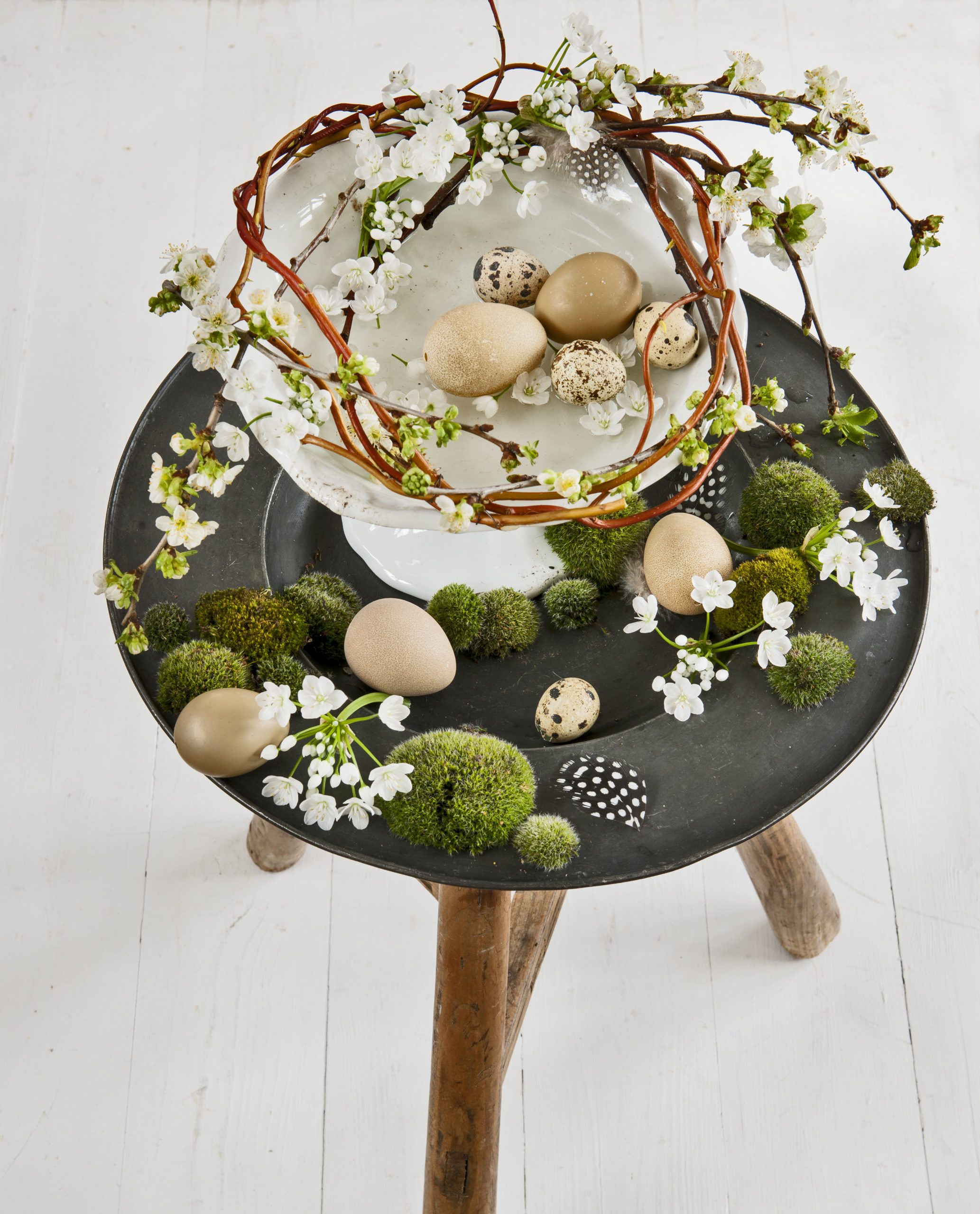 Groot tinnen bord (De Koektrommel). Eitjes (Hans te Kloese). Allium-bloemetjes, mos en veertjes van de parelhoen. Wit schaaltje op voet en krukje zijn privébezit.