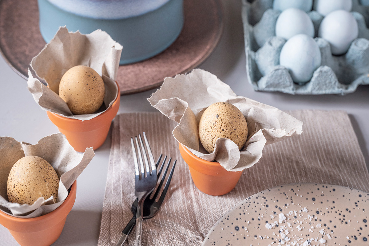 Met Pasen hoort een ei – of meer – er uiteraard bij. En het is wel zo leuk om ze dan zelf te verven. Zo doe je dat – in zachtblauw of bruin met spikkels – met natuurlijke materialen.