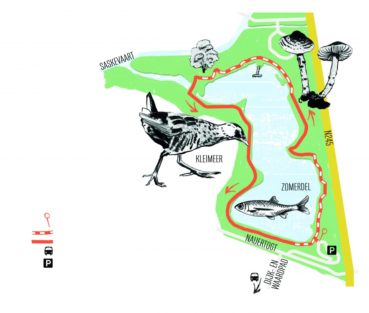 Het water van de Zomerdel wordt omzoomd door rietkragen, in de luwte erachter liggen zwembaaien. Bij baai nummer vijf vallen in een hooilandje de gele bloemen van heelblaadjes op. Hogere ruigtekruiden als guldenroede en koninginnenkruid groeien aan de voet van een heuvel waar je goed uitzicht op de oever van het meer hebt. Het riet kleurt al een beetje oranjebruin, en het zal niet lang meer duren voor alle groen is verdwenen. Op het meest noordelijke puntje van de wandeling staan voor een paviljoen grote abelen. Op een daarvan landt een argusvlinder op de bijna witte stam om zich te warmen aan het zonlicht. Op een steiger tegenover het paviljoen drogen aalscholvers hun gespreide vleugels, kuifeenden dobberen voor hen langs. Vanuit een beschut haventje klinkt het gehinnik van een dodaars. Een smal, niet zo officieel pad leidt een rietveld in om bij een solitaire schietwilg op een grasveld weer bij de ‘officiële route’ uit te komen. Na het beklimmen van de heuvel erachter zijn aan de horizon de beboste duinen bij Schoorl te zien. En de Saskevaart, die het Geestmerambacht verbindt met het Noordhollandsch Kanaal. Op het fietspad op de voorgrond staan in het beton de pootafdrukken van een kraai, als een modern fossiel.