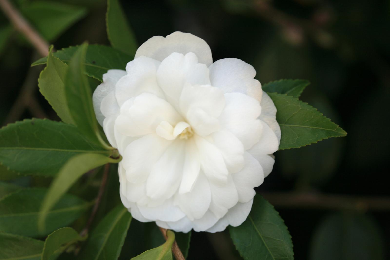 Al heel vroeg in de herfst komen de eerste zuiverwitte, dubbele bloemen uit. Het is niet de Camellia sasanqua met de langste bloeitijd, maar een week of zes toch meestal wel.