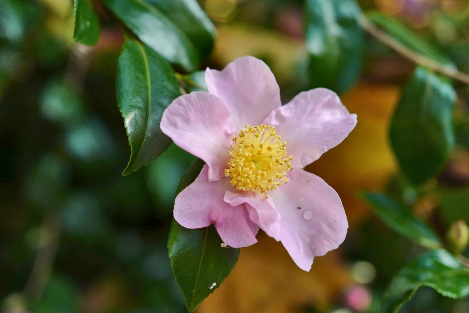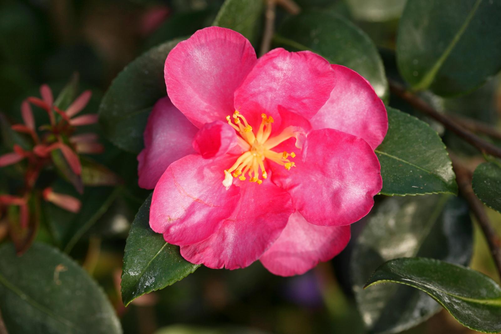 “Als je deze planten in Engeland of Normandië ziet is dat vaak in combinatie met andere bostuinklassiekers, zoals rododendron, magnolia of Japanse esdoorn. Ik ben altijd blij met de complementaire bloeitijd van de herfstcamelia’s, veel van de combinatieplanten bloeien immers in het voorjaar. Als je leuke vaste planten erbij zoekt, denk dan eens aan Brunnera (Kaukasische vergeet-me-niet), Aster divaricatus (bosaster) of Anemone hupehensis (een vroege herfstanemoon). Ook word ik enthousiast van de combinatie met lage Japanse siergrassen zoals Imperata cylindrica ‘Red Baron’ (Japans bloedgras) of Hakonechloa macra (Hakonegras). De beweeglijkheid van het Hakonegras en het strogeel in de winter is een topcombinatie met het glimmend donkergroen van de camelia.”