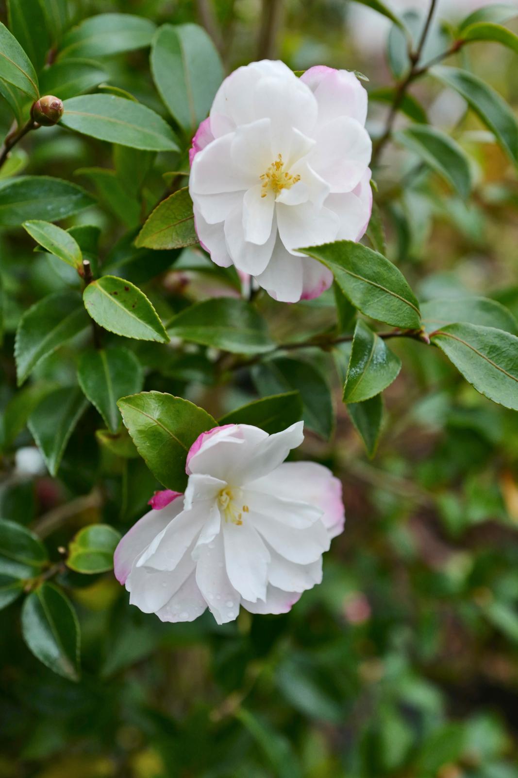 Deze heeft dezelfde kleurstelling als de ‘Hino De Gumo’, wit met een blosje, maar in dit geval zijn de bloemen halfgevuld en heeft de plant een slanke groeiwijze. Ideaal als je weinig ruimte hebt en toch nog een Camellia sasanqua wilt planten.