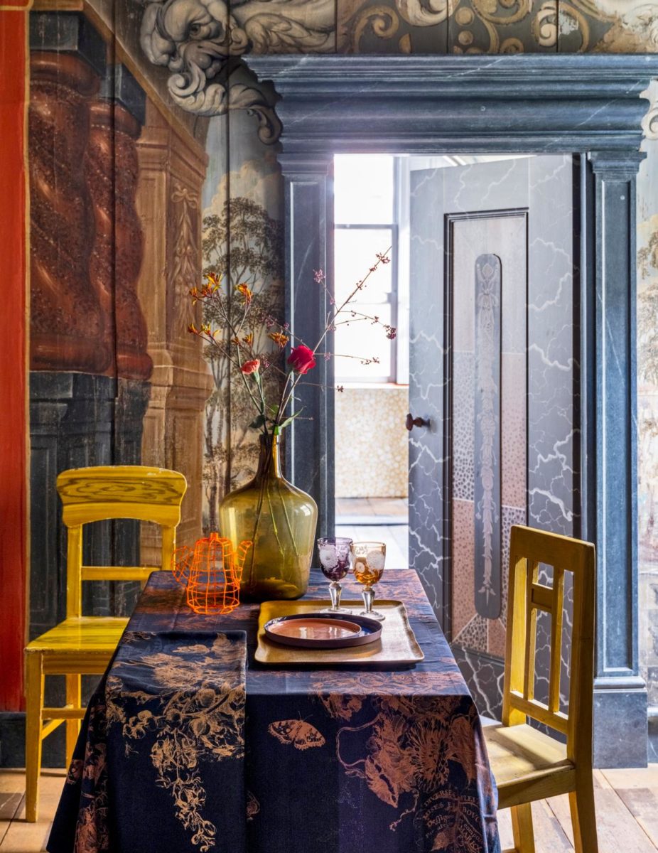 - Bedrukte antieke damasten tafelkleed € 250 en servetten € 30 (www.atelier-markx.nl)