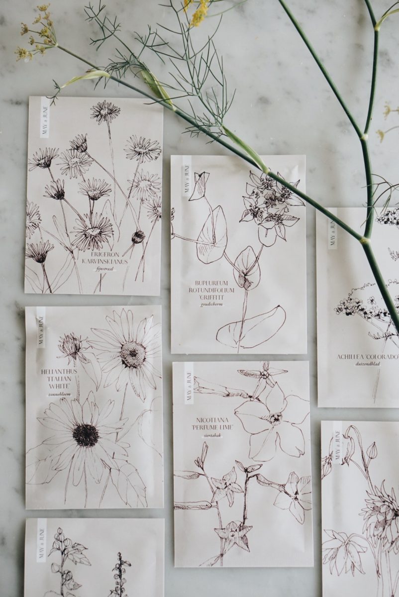 De prijzen variëren per soort en lopen uiteen van € 1,95 tot € 3,95. Goed om te weten: de bloemzaden zijn op een soort na niet biologisch, maar ze zijn wel onbehandeld. Leuk detail: illustratrice Maartje van den Noort – die ook de tekeningen maakt bij de column over vogels in Seasons – illustreerde de prachtige verpakkingen. Tip, bij Studio May & June kun je ook terecht voor die zonnebloem waarvan wij zo fan zijn, de Italian white / White nite…. Bloemeninspiratie op Instagram (en in de story ‘zadenlijn’ ook meer info over hoe biologisch de bloemzaden zijn): @studiomayandjune