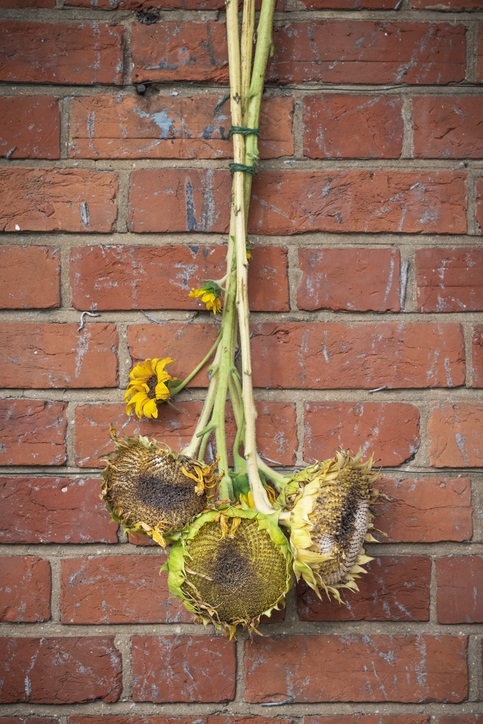Droog een paar zonnebloemen in de schuur en bewaar ze tot de winter, als vogelvoer.