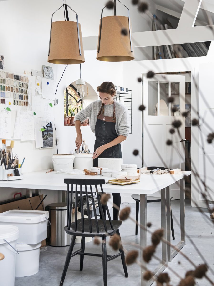De kippenstal was al ingericht als atelier toen Brenda en haar man Florian hier vijf jaar geleden voor het eerst kwamen. Hij hoorde – net als de druivenkas – bij een oud stadsboerderijtje dat te koop stond in de Bredase wijk Princenhage. “De vorige eigenaar, een fotograaf, had hier ook zijn atelier. Ik was direct verliefd op de ruimte en zag me er al helemaal zitten.” Het atelier heeft een mooi licht karakter dankzij fris gestuukte wanden en een nieuwe, gevlinderde betonvloer. De weinige meubels die er staan, zijn eenvoudig. “Alle aandacht gaat uit naar mijn porseleinen objecten en het bijzondere uitzicht.”