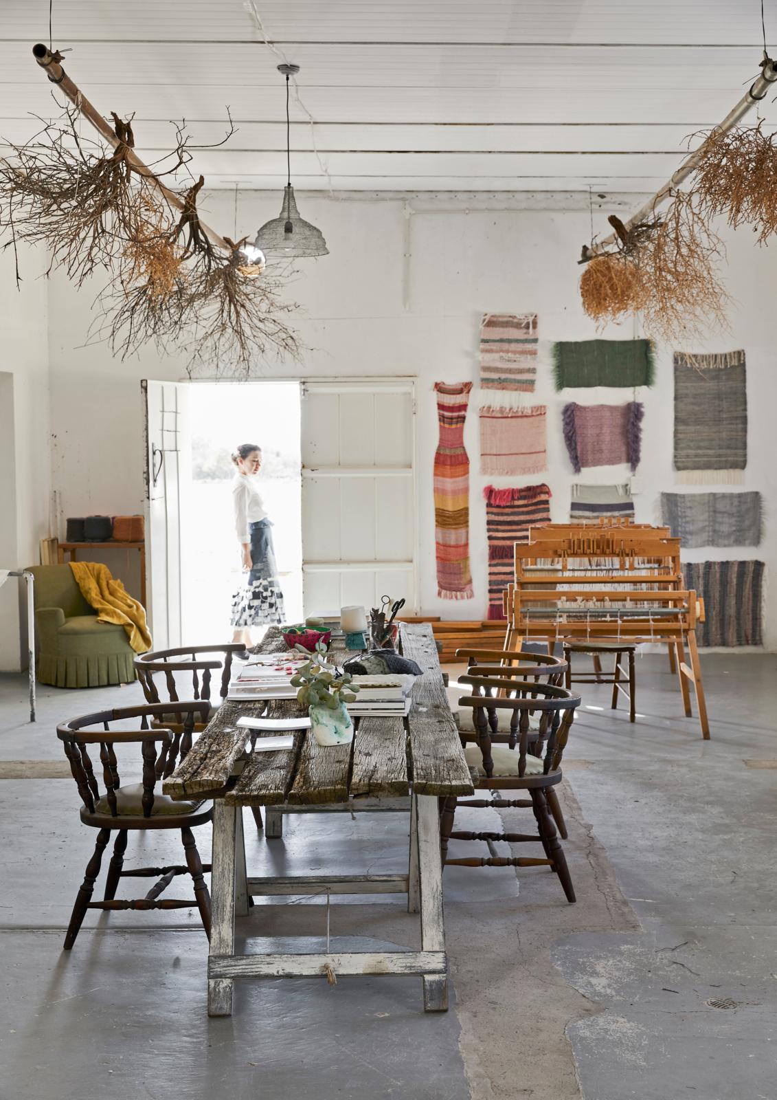 Frances werkt met een handjevol vrouwencollectieven door heel Zuid-Afrika. Elke stap – van het spinnen van het garen tot het weven en bijsnijden van een afgewerkt tapijt – doen zij met de hand. Haar eigen atelier is de plek waar de ideeën geboren worden. Hier verzamelt ze stalen, kleurproeven en ander werk in uitvoering. Er staan verschillende weefgetouwen waarop ze nieuwe kleurcombi’s of patronen uitprobeert. Continu onderzoekt ze de mogelijkheden die mohairtextiel biedt. “Eigenlijk is deze wol het ideale materiaal: door zijn natuurlijke vezel blijven kleuren heel intens, het is makkelijk om schoon te maken en voelt superzacht onder je voeten.” Opvallend is haar ‘inspiratiemuur’, bezaaid met schatten uit de Karoo. Gedroogde kruiden, zaadbollen, takjes: het inspireert haar tot nieuwe creaties. “De natuur is van begin tot einde ‘de rode draad’ in de vloerkleden. Misschien denk je: wat voor inspiratie valt er te halen uit zo’n droog en stoffig landschap? Het dwingt je om verder te kijken. Dan zie je ineens de rijke kleuren van kwetsbare bloemen en struiken of hoe de zon schittert op de rotsen en voor poederbruine tinten zorgt. Dat probeer ik te vertalen in de kleden.”