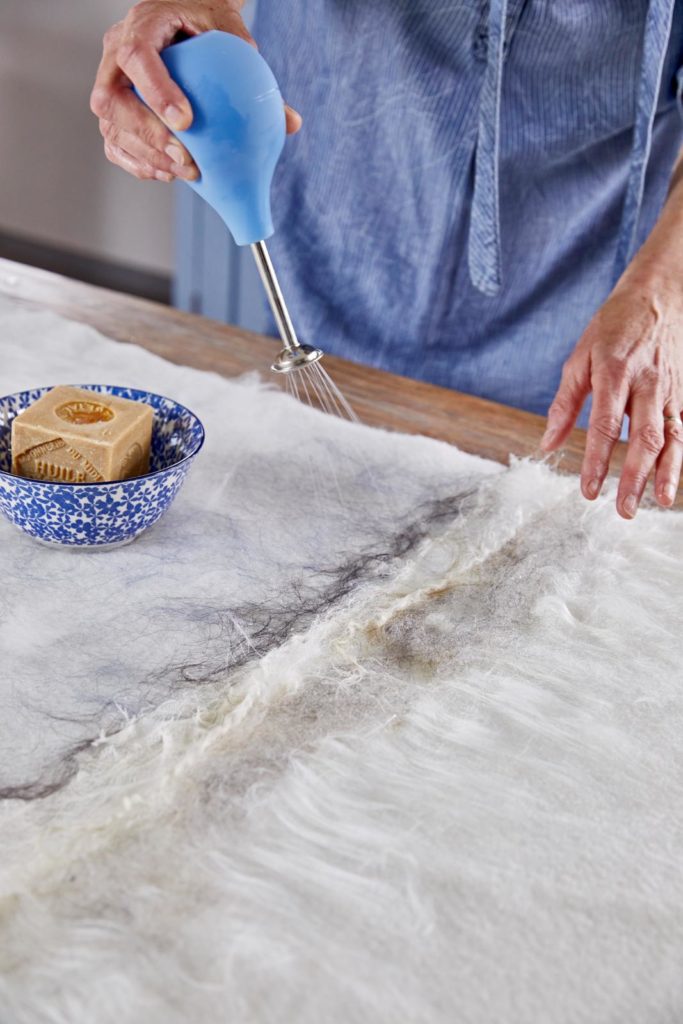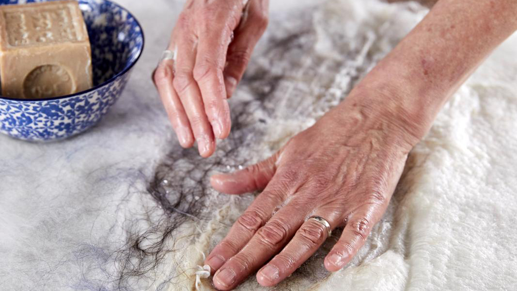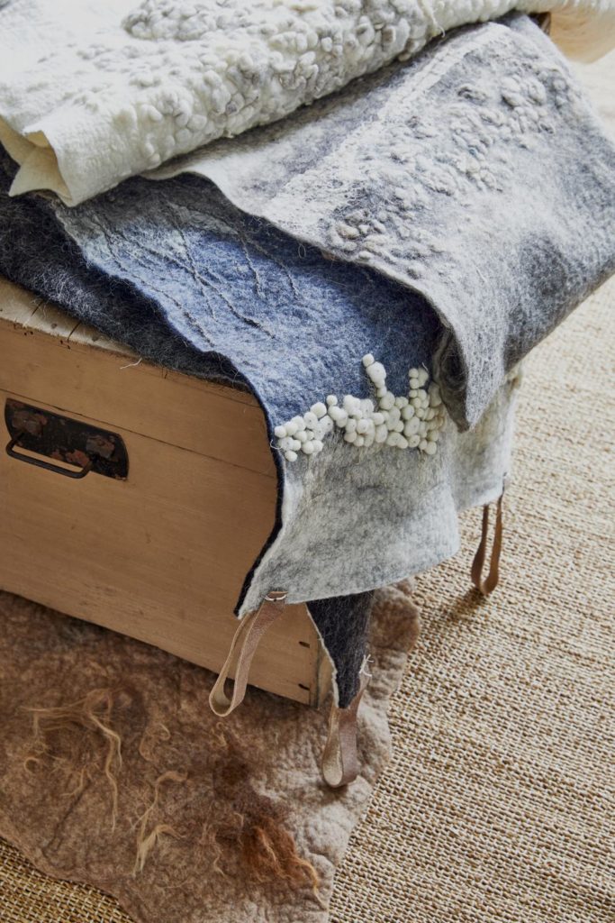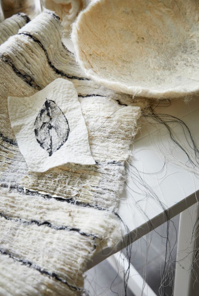 Vilt is een aards en eerlijk materiaal. En tegelijkertijd ongrijpbaar. Je kunt van tevoren een plan hebben van wat je wilt gaan maken, maar het resultaat pakt nogal eens anders uit. Met warm water, olijfzeep en je handen creëer je van plukjes wol een gevilte lap. Door het wrijven, grijpen de vezels in elkaar en door te rollen ontstaat vilt. Hoe een werk precies wordt, is afhankelijk van de materialen en of je zacht of hard wrijft. Wol is eigenwijs en dat vond ik in het begin – vanaf 2008 ben ik ermee bezig – moeilijk. Ik was teleurgesteld als mijn werk er niet precies uitzag zoals ik het in mijn hoofd had. Gaandeweg vond ik het steeds leuker dat wol dwarsligt en weerbarstig is. Je leert erdoor loslaten. Het is allemaal niet zo belangrijk. Eigenlijk kan er niks fout gaan. En als het eindresultaat me echt niet zint, knip ik het in repen en hergebruik ik het.”