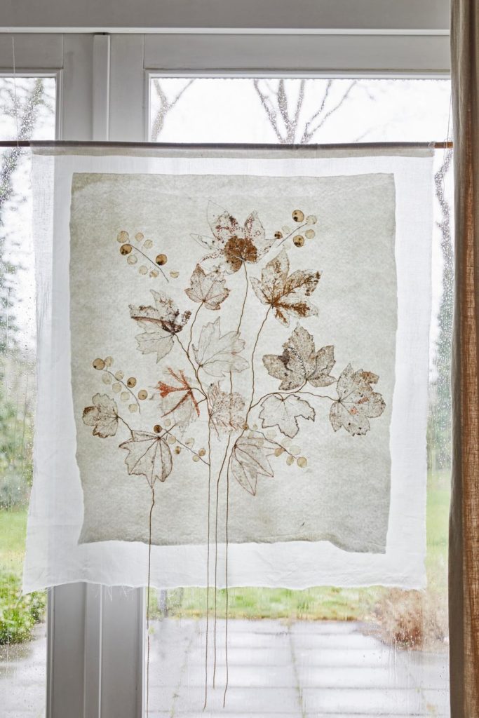 “Kortgeleden heb ik voor het eerst een expositie gehad. Je denkt misschien: maar je bent al sinds 2008 bezig, waarom pas nu? Van nature ben ik niet zo… hoe zeg je dat? Eerder durfde ik het niet. Het voelde zo kwetsbaar. Maar op een gegeven moment dacht ik: of je mijn werk nu wel of niet mooi vindt, het zegt niks over mij persoonlijk. Ik heb geleerd om uit mijn comfortzone te komen. Ik ben altijd nieuwsgierig. Eigenlijk zou ik negen levens moeten hebben, zo leuk vind ik het om continu nieuwe dingen te leren.” Lachend: “Mijn man grapt weleens: dat je mij nog niet beu bent. Maar wat ik onderweg ook allemaal aan kennis opdoe – van etsen tot steendrukken – ik kom altijd bij de basis terug, en dat is vilt. Dat is een liefde die blijft, geldt ook voor mijn man overigens.”