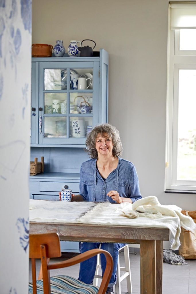 “Ik deed altijd al allerlei creatieve cursussen, maar dat ik vilt, komt ook door mijn moeder. Ze is coupeuse en zat thuis altijd met de naaimachine op tafel. Ze breide, haakte, knoopte kleden. Mijn moeder is nu 85 en maakt nog steeds haar eigen kleding. De liefde voor textiel heb ik dus overduidelijk van haar. Op een gegeven moment stuitte ik op werk van textielkunstenaar Claudy Jongstra, die wol op ambachtelijke wijze vervilt. Ik had nog nooit zoiets gezien. Een hele wand gevuld met een gigantisch modern, abstract doek met allerlei structuren. Alsof ze had geschilderd met wol. Ik was erdoor gegrepen, moést ernaar blijven kijken.”