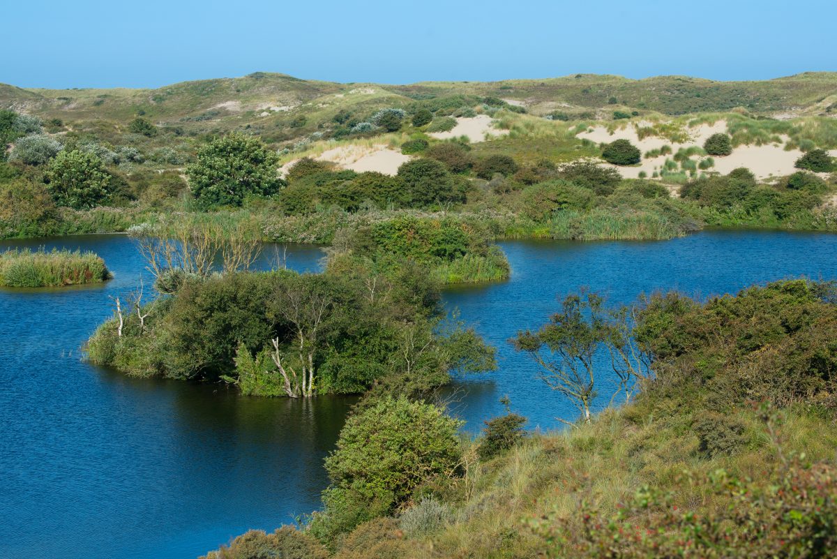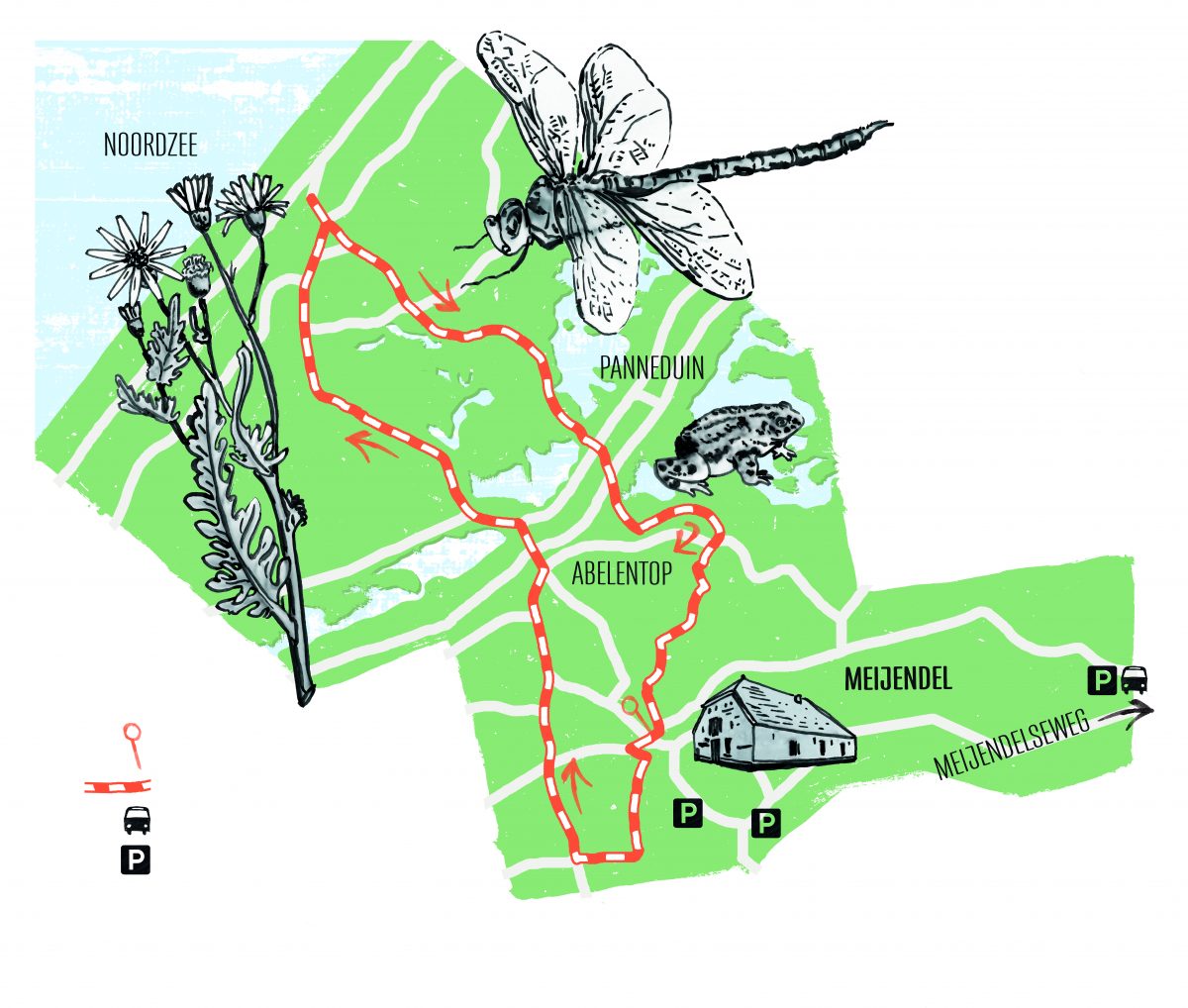 De zon straalt uitbundig op deze zomerse dag, een goed begin voor het lopen van de geel gemarkeerde route. Al snel wandel je door de duinen, waar de struiken korter worden en het jacobskruiskruid welig tiert. De plant bloeit fraai geel, maar is in gedroogde vorm (hooi) giftig voor bijvoorbeeld paarden, omdat ze de lever aantast. Ook mensen moeten oppassen voor dit kruid, want bij huidcontact kan de plant zorgen voor een allergische reactie. Vlinders en bijen zijn er juist weer dol op vanwege de nectar en het stuifmeel. In het zand zijn verse afdrukken van reeënpoten te zien, een buizerd doorklieft de blauwe lucht. De geur van de zee hangt in de lucht. Even later is daar de zee, een kleine klim en je bent bij een uitkijkpunt (B) met bankjes. Dit is, ongeveer halverwege de wandelroute, een prima plek om even uit te rusten, over de zee te turen en de zeelucht op te snuiven. Een heel ander uitzicht biedt de Libellenvallei (C). In dit moerassige stukje natuur wemelt het van het leven. Door de ligging ten opzichte van de Noordzee en de aanwezigheid van zoutminnende planten en het zoete grondwater is dit een bijzonder stukje natuur. De naam Libellenvallei is niet overdreven: libellen scheren hier overal door de lucht en over het water. Zo kun je de grote keizerlibel, de gewone oeverlibel, de platbuik, de viervlek, de paardenbijter en de azuurwaterjuffer aantreffen. Maar ook vlinders zoals de sint-jacobsvlinder – zijn geliefde jacobskruiskruid is immers vlakbij – laat zich hier zien. Maar pas op waar je je voeten neerzet, want je wilt niet per ongeluk op een van de vele rugstreeppadjes (D) gaan staan die hier vrolijk rondspringen!
