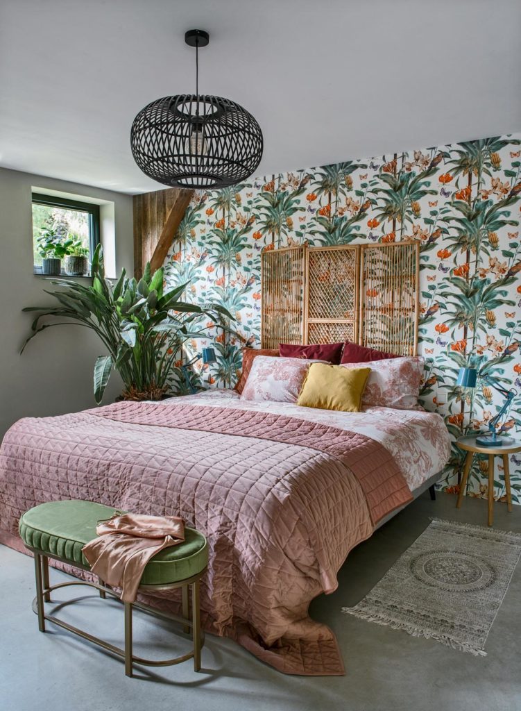 Wonen en natuur met elkaar verbinden: Judith en Gerwin deden het onder meer door het plaatsen van veel glas en door groen in huis, véél groen. In elke ruimte floreren planten en bloemen en overal zie je natuurdessins in kussens, beddengoed, behang, servies en prints. “Ik ben er gewoon dol op”, vertelt Judith, “je zult bij mij geen platte grafische dessins aantreffen.”