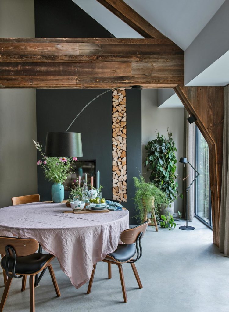 Kleurrijk, noemt Judith haar woonsmaak, “en een tikje industrieel, maar vooral warm.” Industrieel zijn de stalen deuren, en de betonvloeren die mooi en praktisch zijn, maar ook een stoere referentie naar de betonnen buitenwanden. “In de keuken hebben we in de hoogte uitgebroken, daar kwam toen de betonstructuur tevoorschijn. Dat vonden we te koud, dus die hebben we bekleed met barnwood, hout afkomstig van oude schuren.”