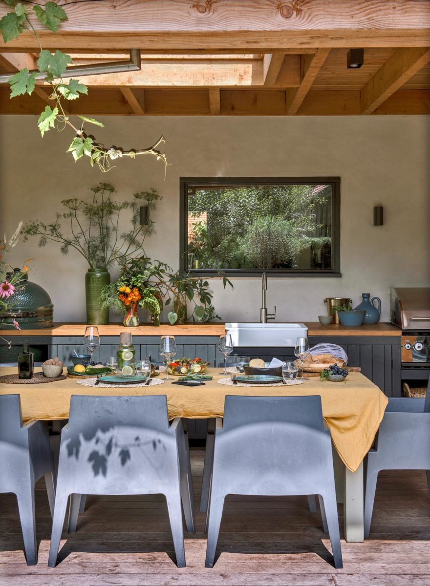 Wonen verbinden met de natuur heeft ook een diepere betekenis voor Judith en Gerwin: duurzaamheid staat hoog in hun vaandel en was een belangrijke leidraad bij de verbouwing. Ze verbruiken amper gas meer, installeerden zonnecollectoren, een warmtepomp en een groot buffervat voor water. “Waar mogelijk hebben we materialen hergebruikt, zo heeft Gerwin de buitenkeuken getimmerd van hout dat nog in de schuur lag.”
