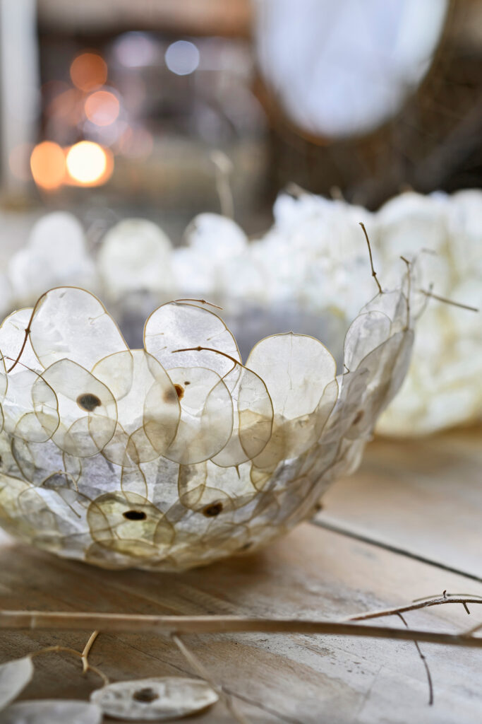 - Als je een waxinelichtje in dit kommetje zet, valt het kaarslicht prachtig door de judaspenningen.