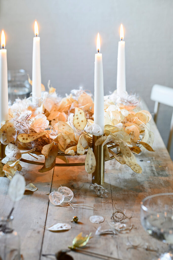 - Voeg als laatste extra pluizige takjes en losse takjes gepelde judaspenning toe en leg de krans boven op een ronde kandelaar.