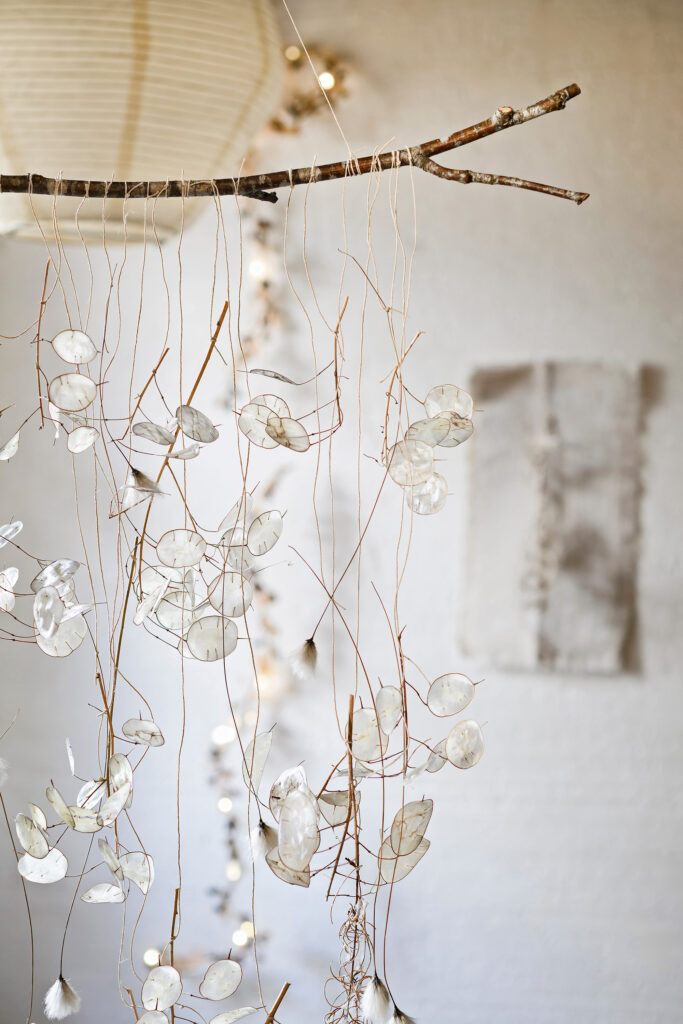 Een feestelijke krans van gedroogde, ongepelde judaspenning in combinatie met ‘gepelde’ glanzende judaspenning en pluizige takjes gevonden in de natuur. Juist door deze combinatie ontstaat er een levendig en mooi geheel, vooral als de kaarsen aan zijn.