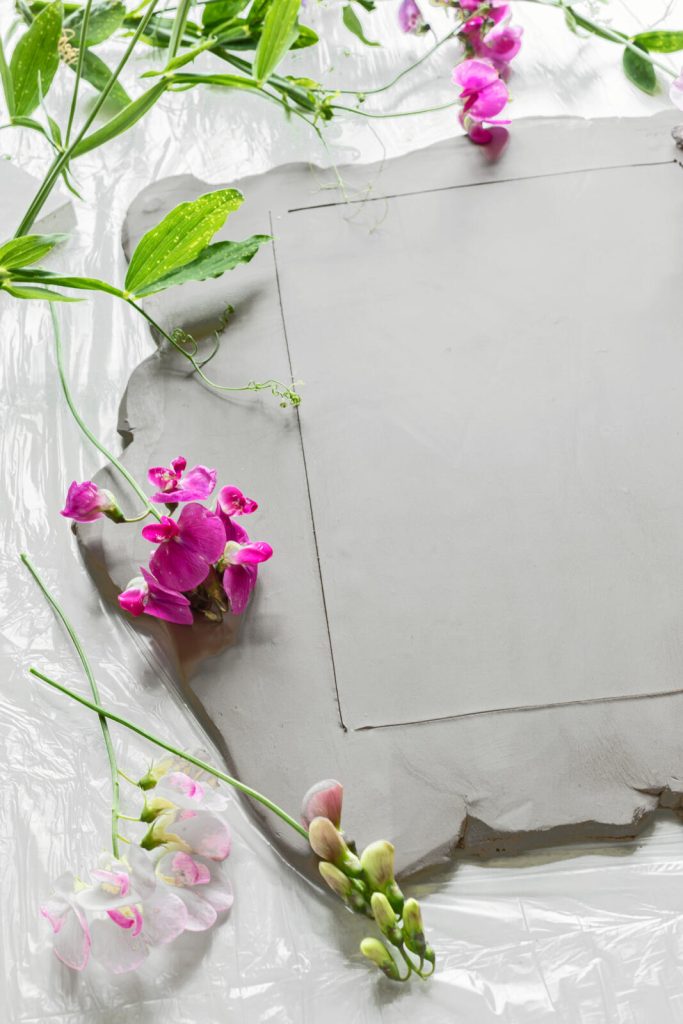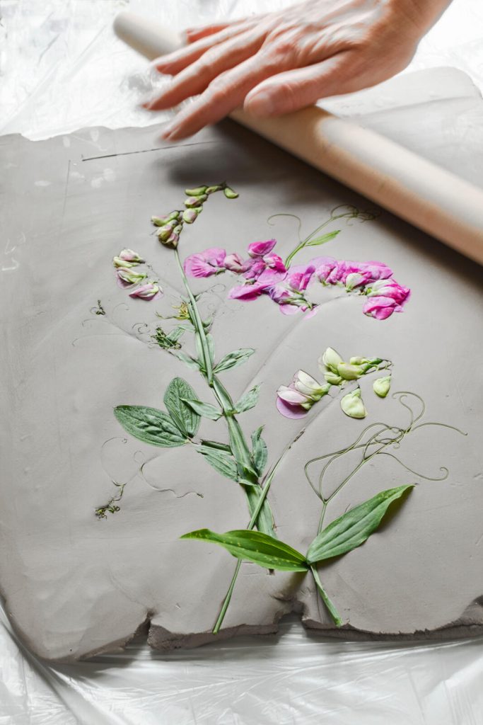 • Rol de klei uit zodat hij iets groter is dan de gietmal. Om een mooi reliëf te krijgen, moeten de plantendelen er een beetje worden ingedrukt – soms dieper en soms wat lichter. Houd daarom zeker 2-3 cm aan.