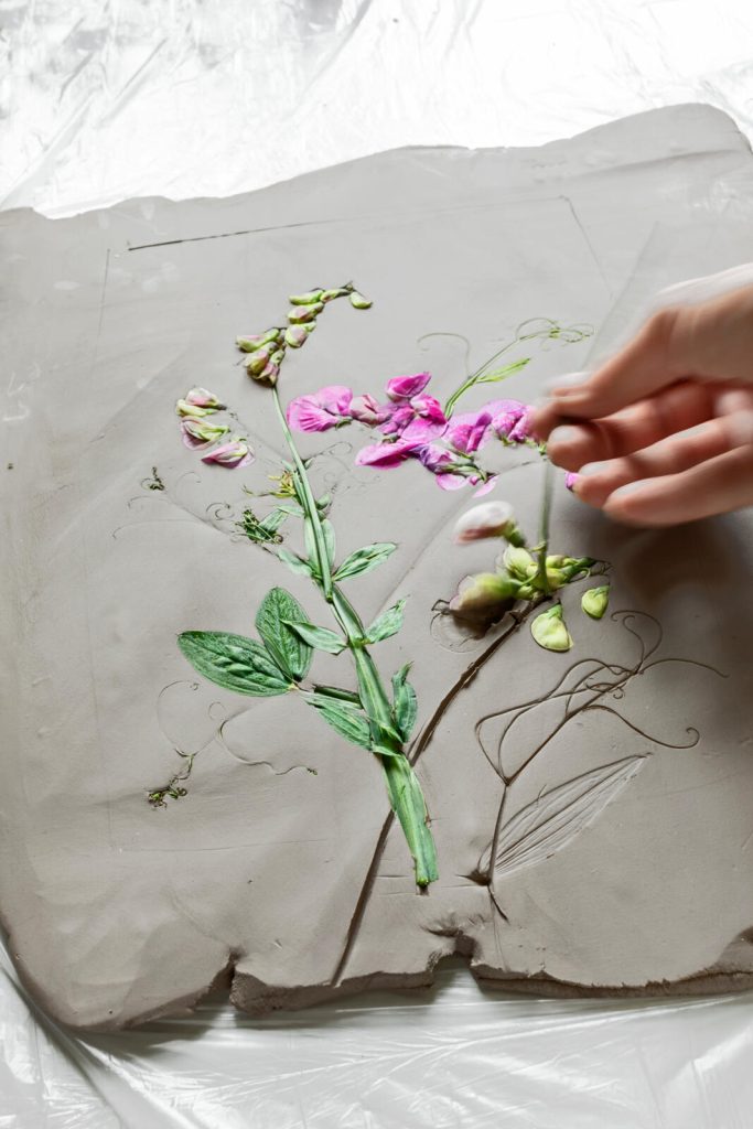 • Maak een compositie van de bloemen en plantendelen op de klei. Zorg ervoor dat de bladeren en bloemen mooi uitgewaaierd zijn en geen knikken hebben.