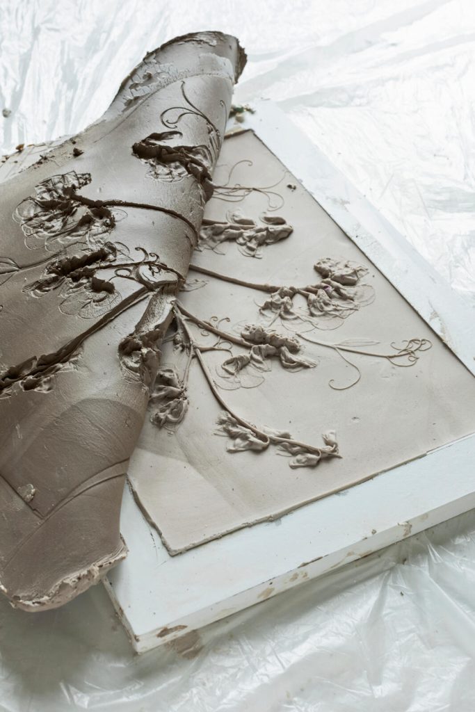 - Rol de klei uit zodat hij iets groter is dan de gietmal. Om een mooi reliëf te krijgen, moeten de plantendelen er een beetje worden ingedrukt – soms dieper en soms wat lichter. Houd daarom zeker 2-3 cm aan.