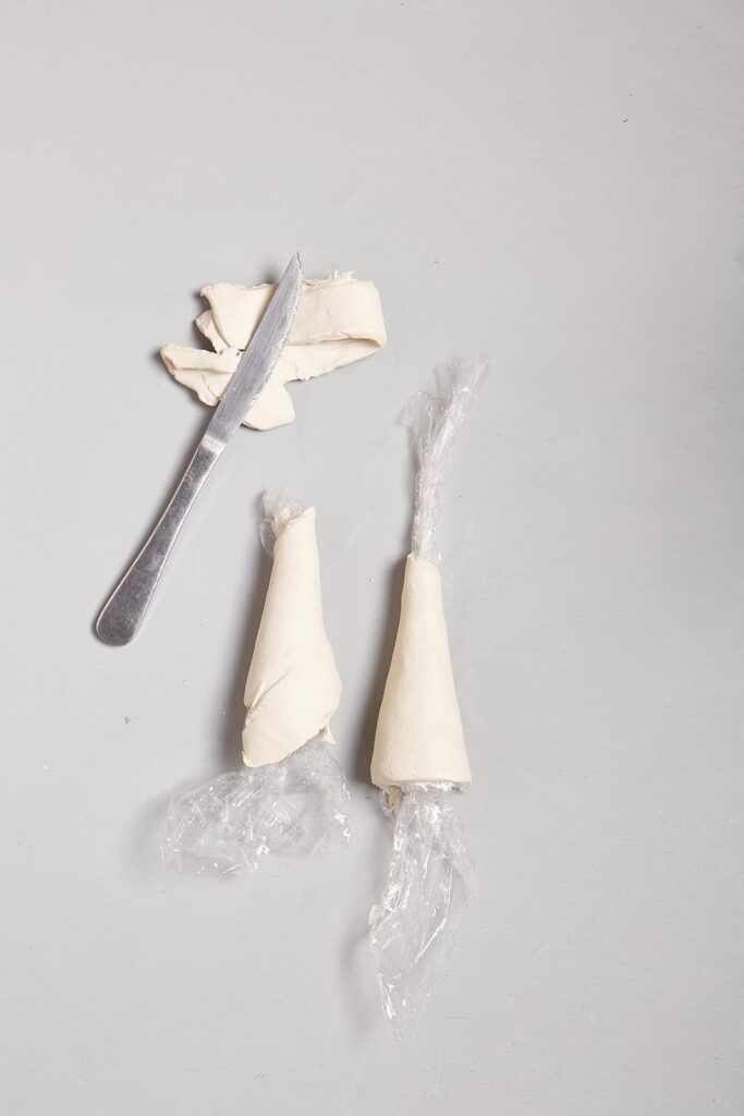 - Maak een kegel van stevig maar oprolbaar karton. Zet vast met tape en omwikkel met vershoudfolie.