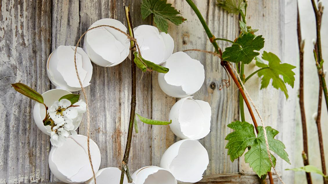 Tip: Leg de paaskrans plat op een mooi gedekte tafel met een beetje water in de eierschalen zodat je er verse bloemen in kunt leggen.