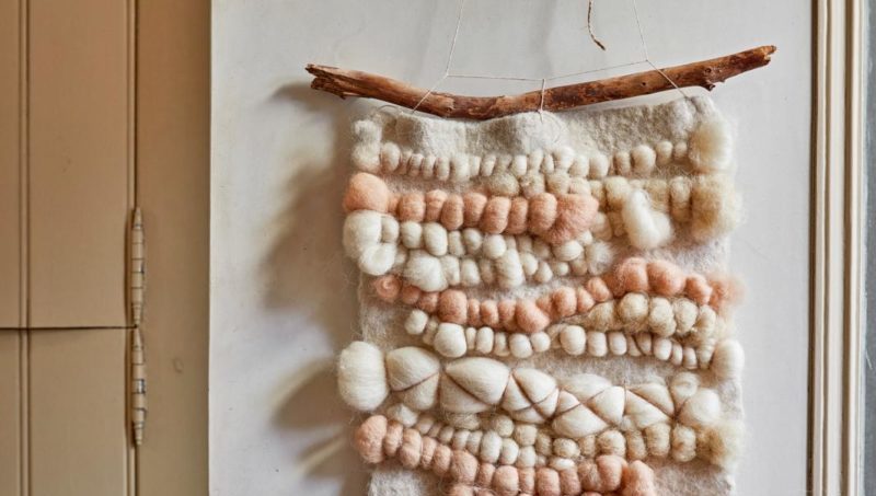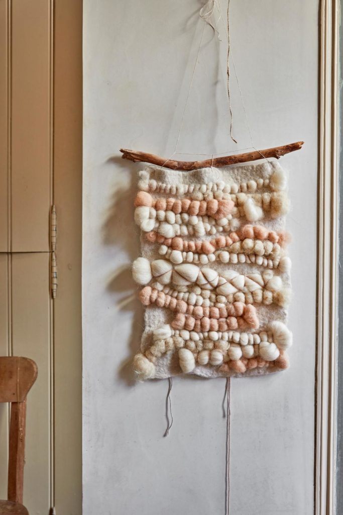 Leuk voor aan de muur: een kleedje dat je zelf hebt gemaakt van wol. Koop wol in kleuren die goed bij elkaar gaan, of juist met een contrasterende kleur erbij als je dat mooi vindt. Verder is het naaien, verschillende soorten steken gebruiken, en dan vormt het kleedje zich (bijna) als vanzelf. Nog een mooie tak om het aan op te hangen en klaar is kees.