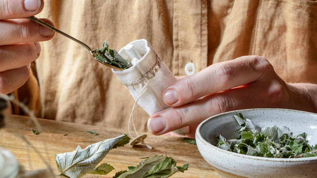 Zelfgemaakte herbruikbare theezakjes zijn duurzaam en ideaal voor het maken van thee van verse bladeren.
