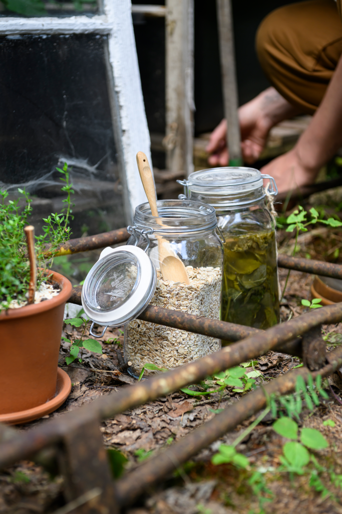 De weckpot met haver is tegen de slakken. Elke ochtend en avond lopen we door de tuin om de gulzige dieren te verzamelen en ver weg van de kruidentuin te deponeren. Maar dat is helaas niet afdoende. Een kring van havervlokken rond je planten strooien kan helpen, want slakken vinden het vervelend om daar overheen te kruipen.