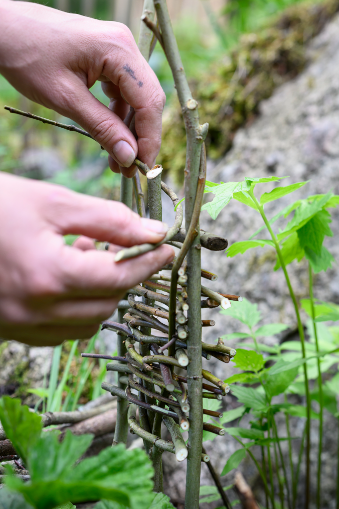 Er zijn planten die wel een steuntje in de rug kunnen gebruiken én niet van wind houden. Het is heel leuk om een rekje te maken van snoeiafval. Gebruik jonge, soepele takjes van bijvoorbeeld wilg, die buigen makkelijker. Kies drie grotere takken als basis en vlecht daar takjes tussen. Als je een begin hebt gemaakt, kan het handig zijn het rekje alvast op de gewenste plek in de aarde te steken, zodat het vlechten makkelijker gaat.