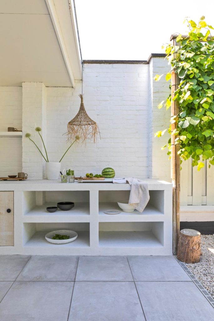 De buitenkeuken maakten Jacqueline en Frank zelf van betonblokken en een paar dwarsliggers van natuursteen. Jacqueline: “Voor het werkblad maakten we een houten bekisting en daarin is beton gegoten. Toen het blad droog was en de bekisting eraf, is het werkblad iets opgeschuurd, met een sealer behandeld (zodat het beschermd is tegen vlekken, red.) en met betonverf gewit. De rest is gestuukt, er ging een laag primer op, en daarna buitenverf van Remmers. Ook het deurtje maakten we zelf van wat planken en een grote stalen spijker als knop.”