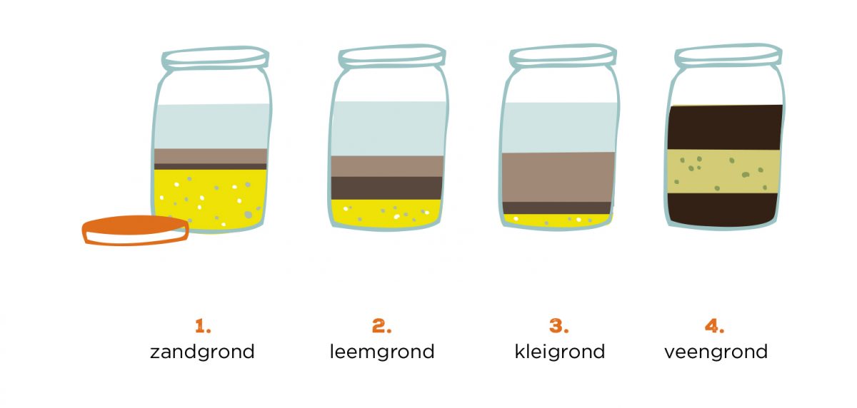 In Nederland zijn vijf grondsoorten die je aan de oppervlakte vindt: zand, zeeklei, rivierklei, veen, en löss. Dan is er nog de grondlaag leem, die verspreid door Nederland voor kan komen, vaak dieper in de bodem. Als je weet wat voor grond je hebt, kun je de beplanting daar op afstemmen. De grond in je tuin kan verschillen per plek en ook verschillen van de grond in buurtuinen. Hoe kom je erachter uit wat voor grond jouw tuin bestaat? Daarvoor bestaan verschillende methoden – zoals de knijptest, de observatietest, de potjestest (hier lees je daar meer over) en de grondboortest.