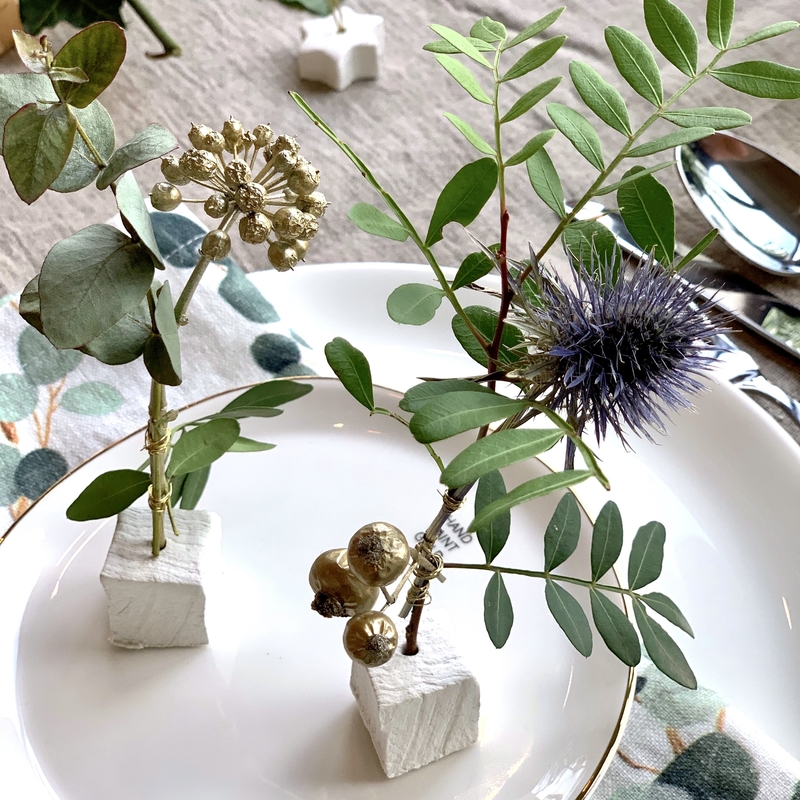 Deze kleine groendecoraties kun je op een bord zetten of verspreid over de tafel. Maak kleine blokjes van zelf-drogende klei met een gaatje erin. Steek er klein boeketjes in van groentakken, goud gespoten bessen en kleine bloemen.