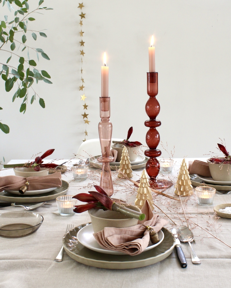Amaryllissen – eigenlijk hippeastrum – zijn volop verkrijgbaar in de wintermaanden en staan prachtig op de kersttafel in combinatie met oud-roze en goud. Kandelaren brengen hoogte op tafel en geven daarmee de tafel allure en feestelijk sfeerlicht.