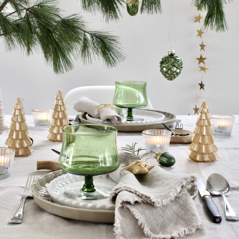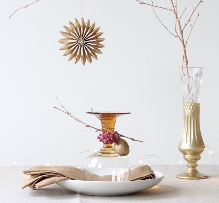 Hoogte creëren met servies is een stuk spannender dan 3 platte borden op elkaar. Je kunt bv een mooi glas onderste boven op het bord zetten met een mini boeketje eraan, takje, besjes en een goud gespoten walnoot. Je bindt het met dun gouddraad vast aan het glas. Wil je het persoonlijker maken, hang er een klein kaartje aan met een persoonlijke tekst.