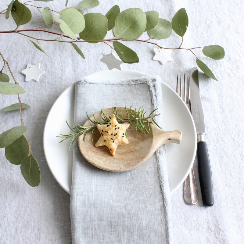 Een kleine amuse op het bord als men aan tafel gaat staat heel welkom. Hier een kleine ster van bladerdeeg met kaas en maanzaad op een vers takje rozemarijn. Leg het servet tussen de lagen servies in dat verzacht de harde materialen en geeft een mooi kleurcontrast.