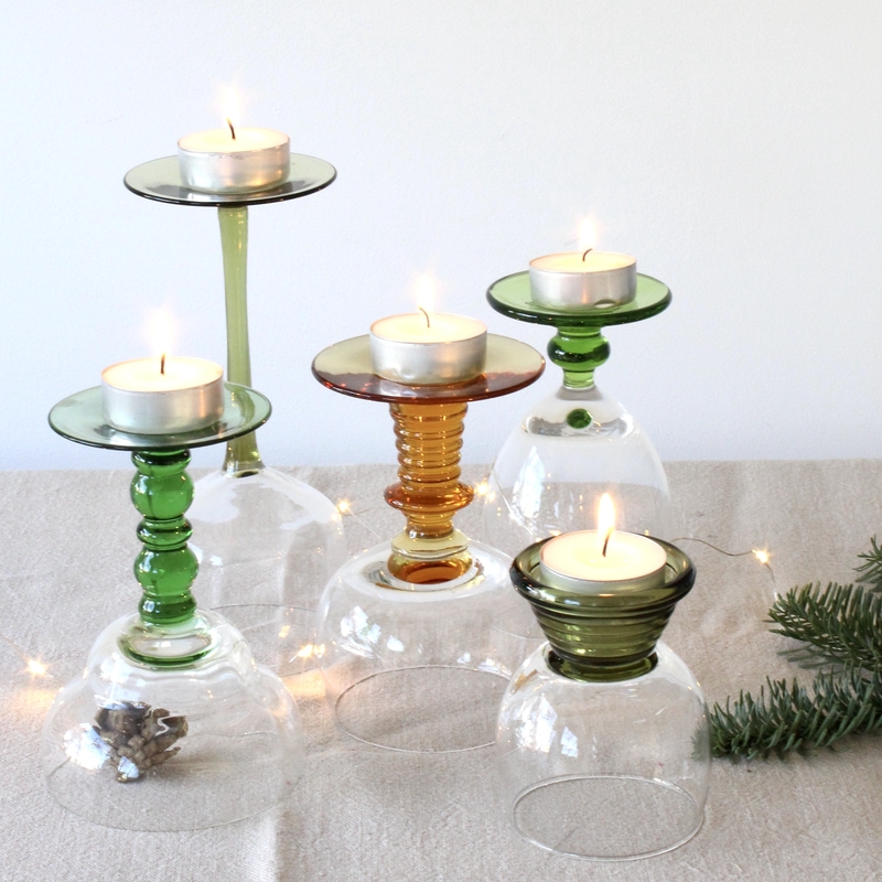 Creëer je eigen kandelaars met mooie glazen in een groep bij elkaar. Zet ondersteboven met waxinelichtje bovenop. Let op verschillende hoogtes en vormen van de glazen voor een spannend geheel. Je kunt ook een kleine decoratie of dennenappel onder een glas leggen.