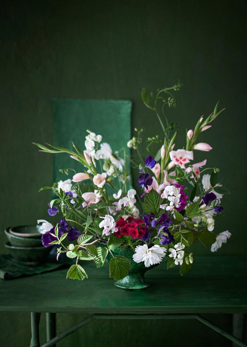 Dit pronkstukje met pronkerwten, zoals de Nederlandse naam van lathyrus luidt, lijkt wel uit een zeventiende-eeuws schilderij te komen. Het ziet er heel kunstig uit, maar je maakt het zelf heel eenvoudig. Plaats een kenzan (bloemenprikker) in een schaal en/of maak van een stukje kippengaas een prop. Druk die in het schaaltje, dit zorgt ervoor dat de bloemen stevig blijven staan. Steek de bloemen in de prikker en tussen het kippengaas. Wij gebruikten behalve Lathyrus odoratus en Lathyrus latifolius ook Phlox, Cosmea, frambozenstruikblad en Gladiolus nanus.