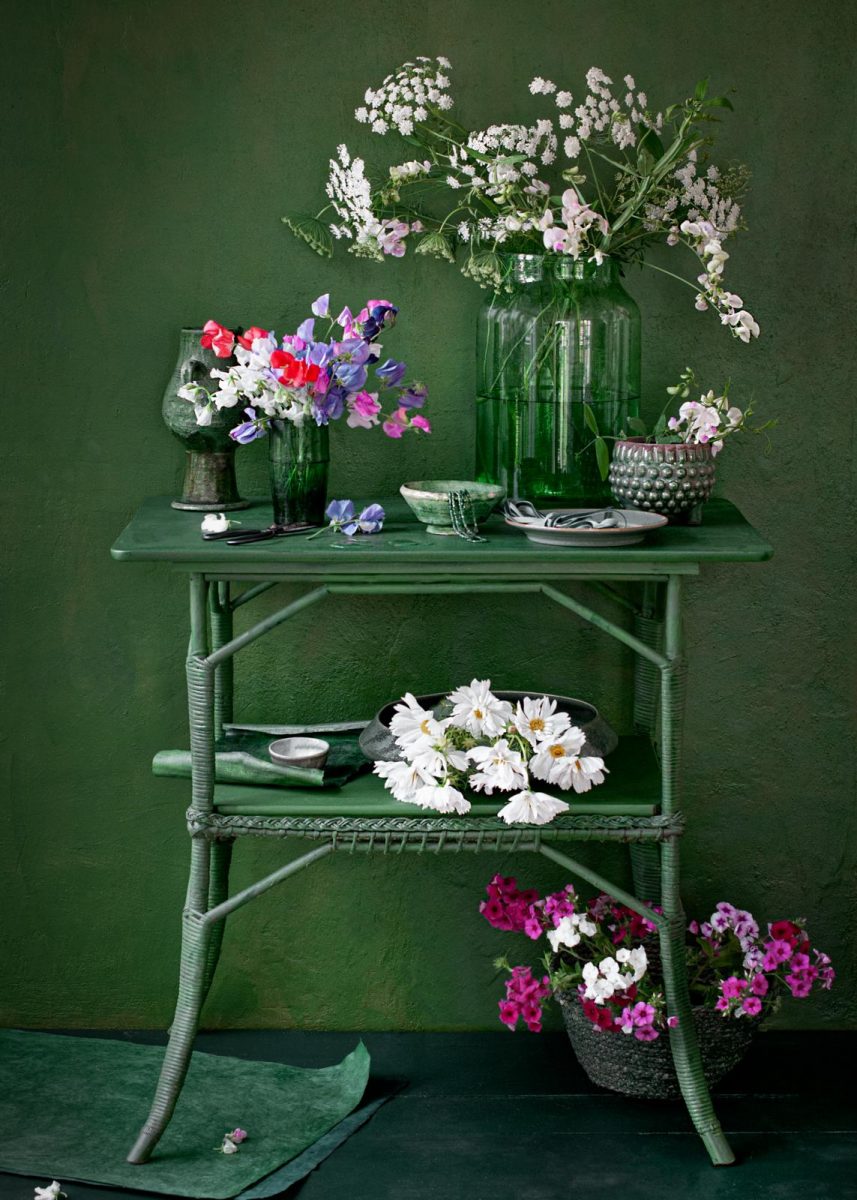 In het groene glazen vaasje links (householdhardware.nl) een boeketje Lathyrus odoratus. De hoge glazen vaas (weldaad.com) is gevuld met Ammi majus (kantbloem) en ranken Lathyrus latifolius. Het keramieken potje (soortgelijke bij intratuin.nl) met Lathyrus latifolius. Op de onderste plank een bosje Cosmos ‘Psyche White‘ en op de vloer een bos kleurige Phloxen.