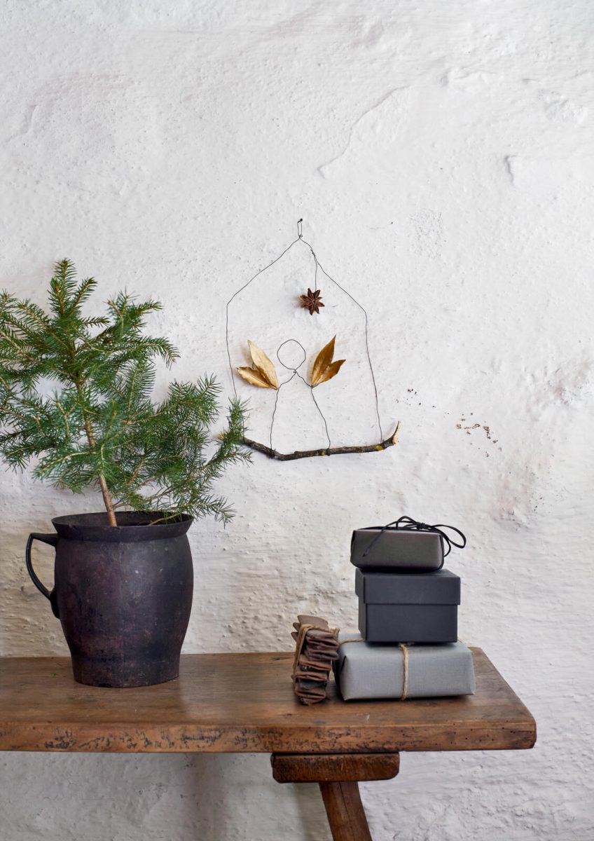 Deze engel, in meest basic vorm, is prachtig als subtiele kerstversiering op de muur of voor het raam. Dit wandschilderijtje is gemaakt van dun bloemdraad en een takje. De gouden vleugels van de engel bestaan uit gekleurde laurierbladeren. Een steranijs wijst de drie wijzen de weg.