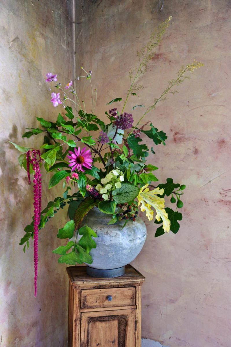 - Deze basis is stevig genoeg om er in ton sur ton-laagjes nog wat bloem en blad aan toe te voegen, zoals het opvallende blauw-paars van de luchtige grote wasbloem, rodekoolblad en wat fluweelhortensia.